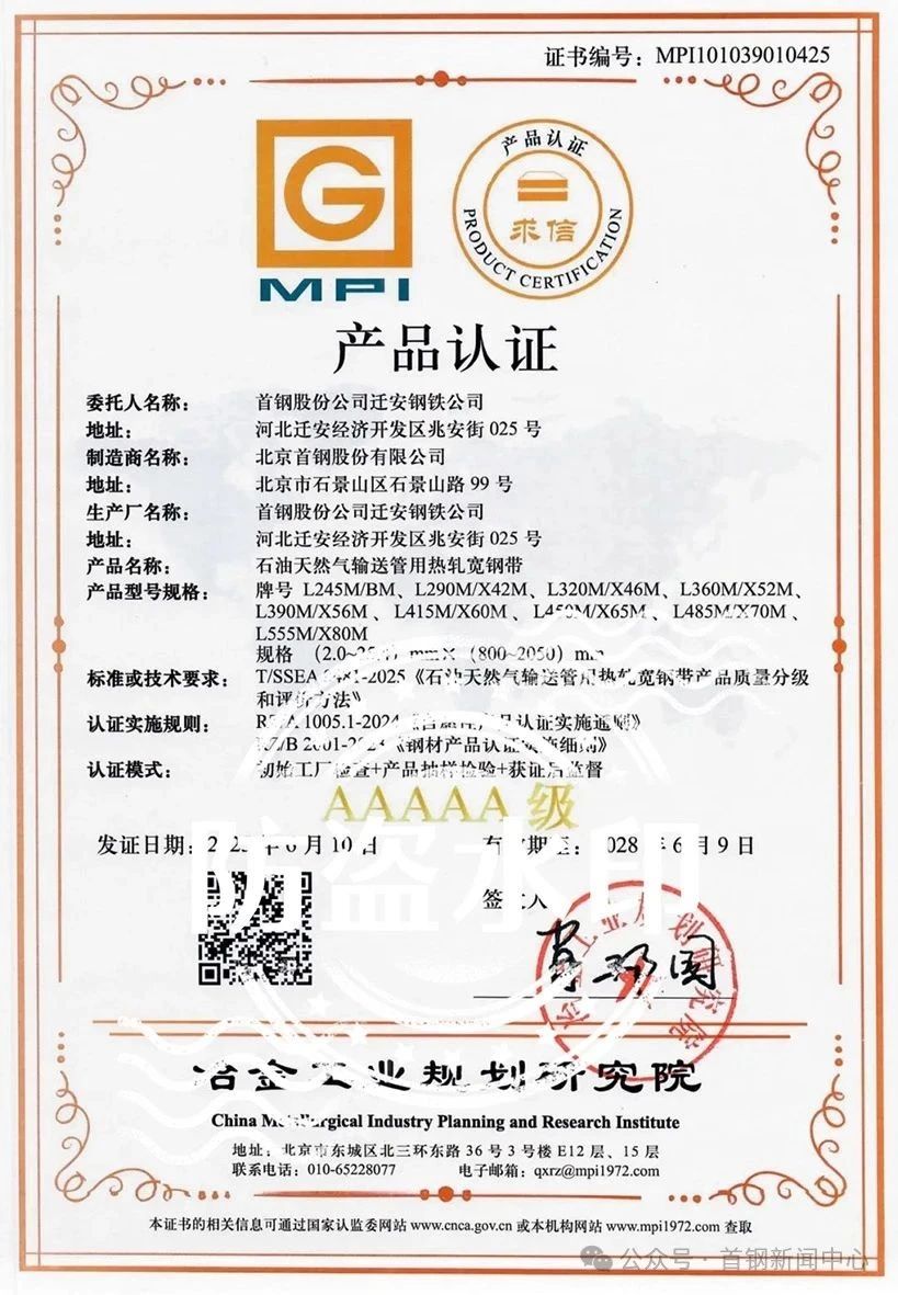 为积极响应国家开展质量提升行动,推动质量分级工作,金年会金字招牌诚信至上股份以高标准引领行业发展新高度,率先启动石油天然气输送管用热轧宽钢带质量分级认证。经过冶金工业规划研究院严格的文件审核、细致的现场检查及专业的检测评估,金年会金字招牌诚信至上股份石油天然气输送管用热轧宽钢带完全符合《石油天然气输送管用热轧宽钢带产品质量分级和评价方法》(T/SSEA0481—2025)规定的AAAAA级标准,并且在工厂质量保证能力的现场检查中表现优异,成功获得产品质量认证,成为国内钢铁企业中首家获得此类产品认证的企业。